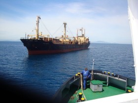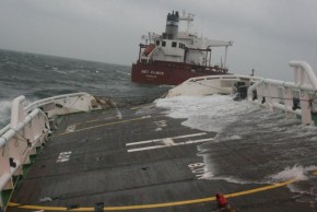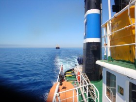 The salvage team continued to improve the sustainability of the e-systems on board the "EVERTON", the emergency generator was successfully started up providing lights on the starboard side, and navigation lights were reinstated, etc. Due to the bad weather salvage tug "TERAS HYDRA" did not arrive until the 4th October 2012, and came alongside to provide water and food supplies. Afterwards "TERAS HYDRA" connected the tow line to the "EVERTON" and the convoy proceeded towards Beira.