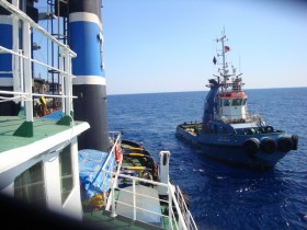 Attempts to connect towline by "FALISCA" failed due to adverse weather conditions. For safety reasons the AHTS "VOS THALASSA" (abt 6000 BHP, 65TBP) was contracted. . The delayed arrival of "VOS THALASSA" occurred on 25th November following which the conditions improved significantly allowing for her towline to be connected. The T/B "FALISCA" was released and towage by "VOS THALASSA" commenced with "MEGAS ALEXANDROS" escorting the convoy.