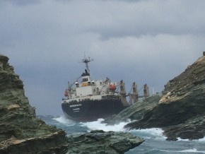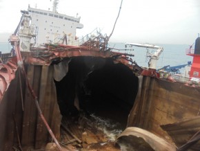 The salvage team managed to board the vessel on 15 February in order to carry out an inspection. It was reported that the engine room, the fore peak tank, and the cargo holds No 1, No 3, No 4 and No 5 were flooded, whilst cargo holds No 4, No 5 and the engine room were contaminated with fuel oil. The vessel was wedged between rocks aft and had a 12-degree list to port.