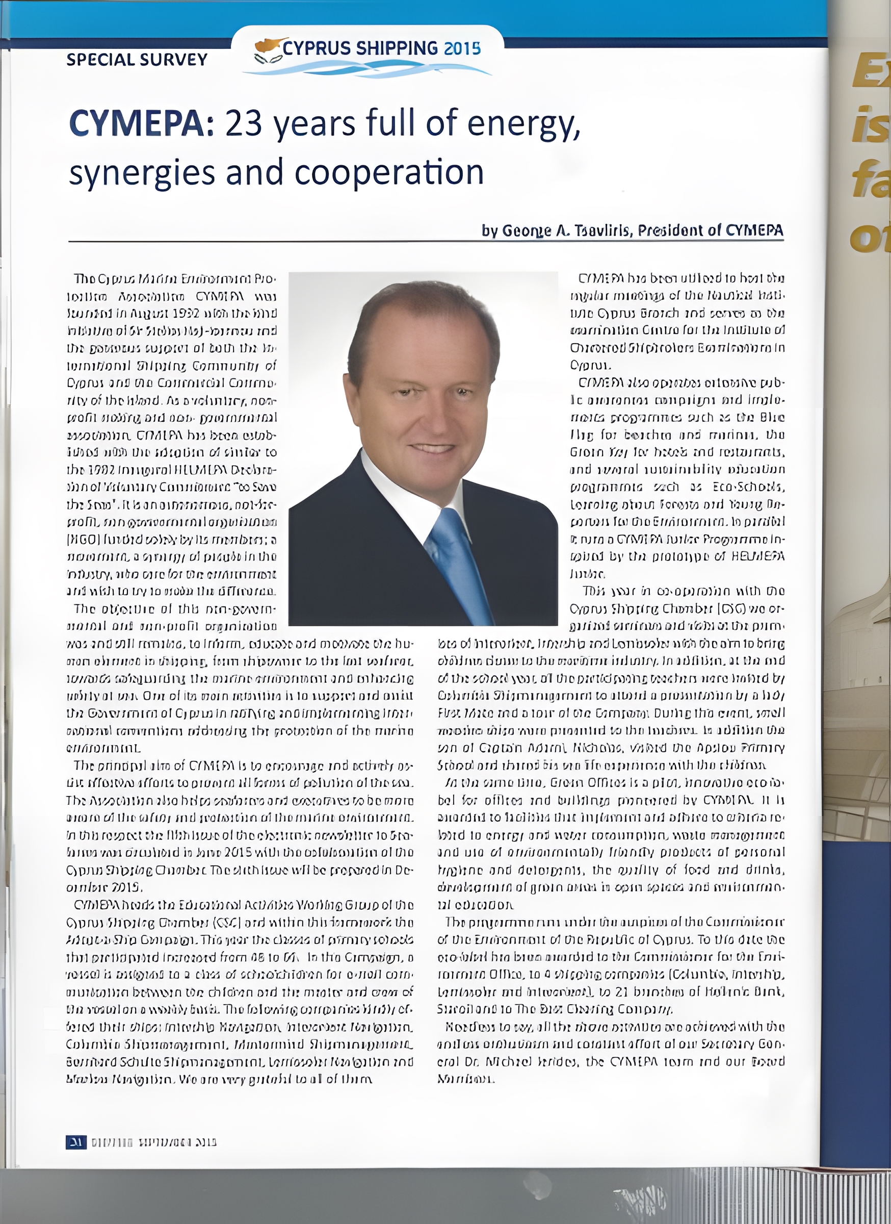 The principal aim of CYMEPA is to encourage and actively assist effective efforts to prevent all forms of pollution of the sea. The Association also helps seafarers and executives to be more aware of the safety and protection of the marine environment. In this respect the fifth issue of the electronic newsletter to Seafarers was circulated in June 2015 with the collaboration of the Cyprus Shipping Chamber. The sixth issue will be prepared in December 2015.