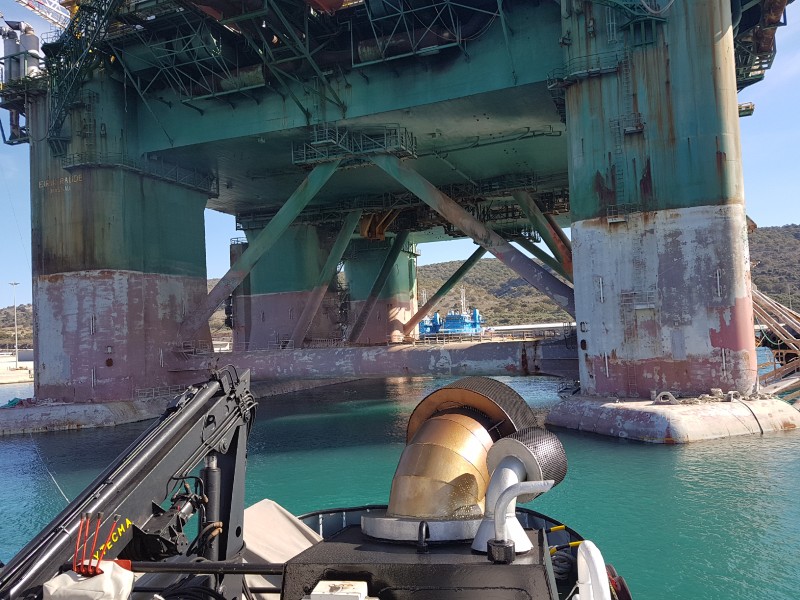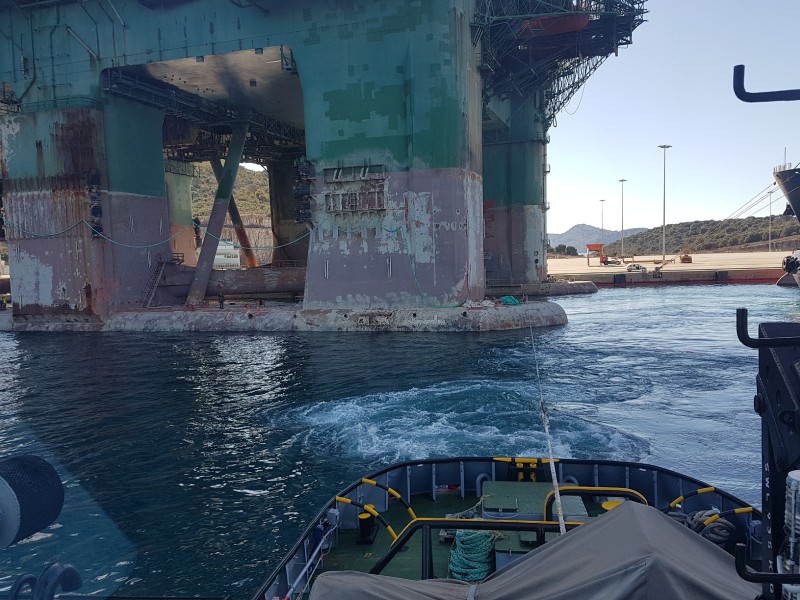 Tsavliris tug boats "HERMES" and "HERMES I" mobilised from Patras, Greece, and upon arrival provided stand by services. On 22 November the tugs connected and shifted the platform back to her berth No.2 thus completing the operation.