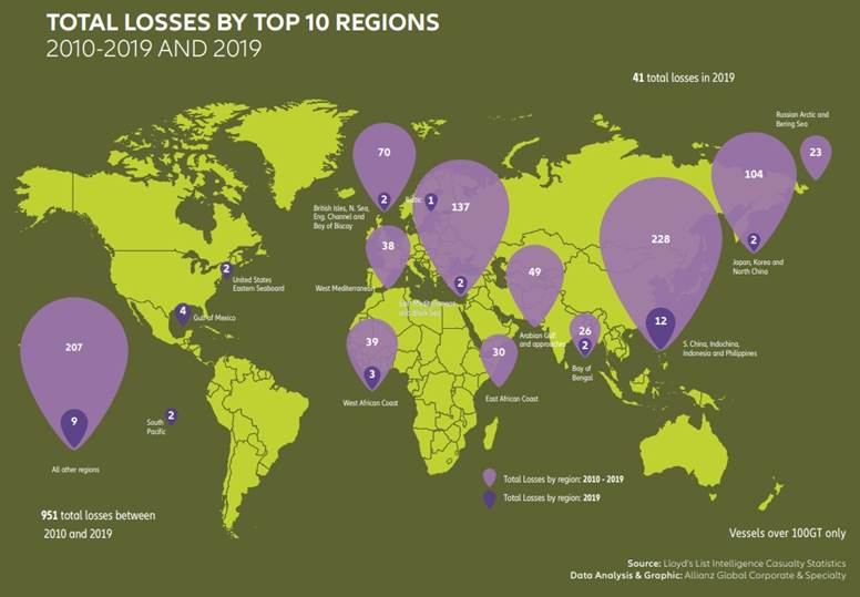 South China, Indochina, Indonesia and the Philippines maritime region remains the main loss hotspot, accounting for almost 30% of losses over the past year with 12 vessels. These waters are also the major loss location of the past 10 years, driven by factors including high levels of local and international trade, congested ports and busy shipping lanes, older fleets, exposure to typhoons and ongoing safety problems on some domestic ferry routes.