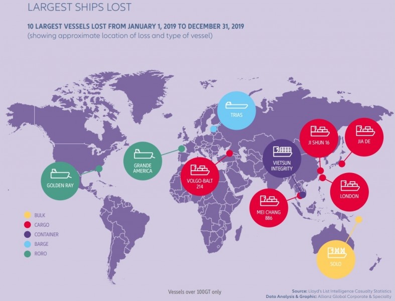 Cargo vessels (15) accounted for more than a third of all total losses during 2019 with the majority occurring in South East Asian waters. The number of losses involving ro-ro vessels