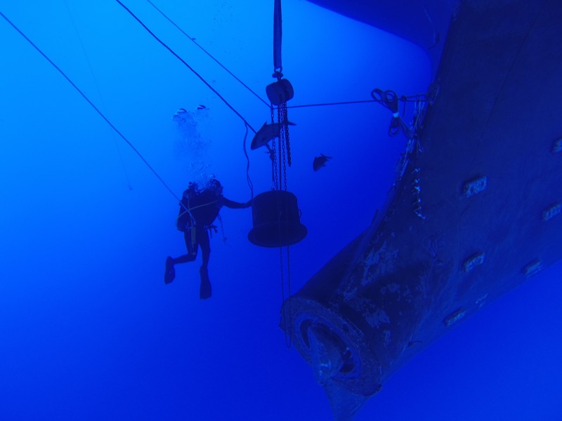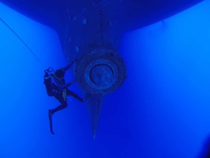 Following an inspection by the salvage and dive team, it was found that the tailshaft had sheared off by way of the aft simplex seal and had been lost along with the propeller. Salvors secured the tailshaft from the engine room side and sealed it from both sides by fabricating/installing a steel box on the seaside and a cement box on the engine room side. To reinforce the engine room structures, additional brackets and vertical stiffeners were welded in place.