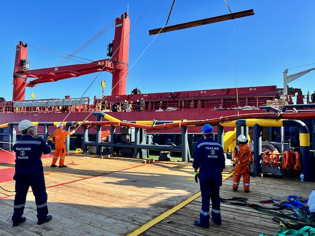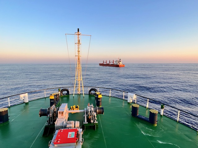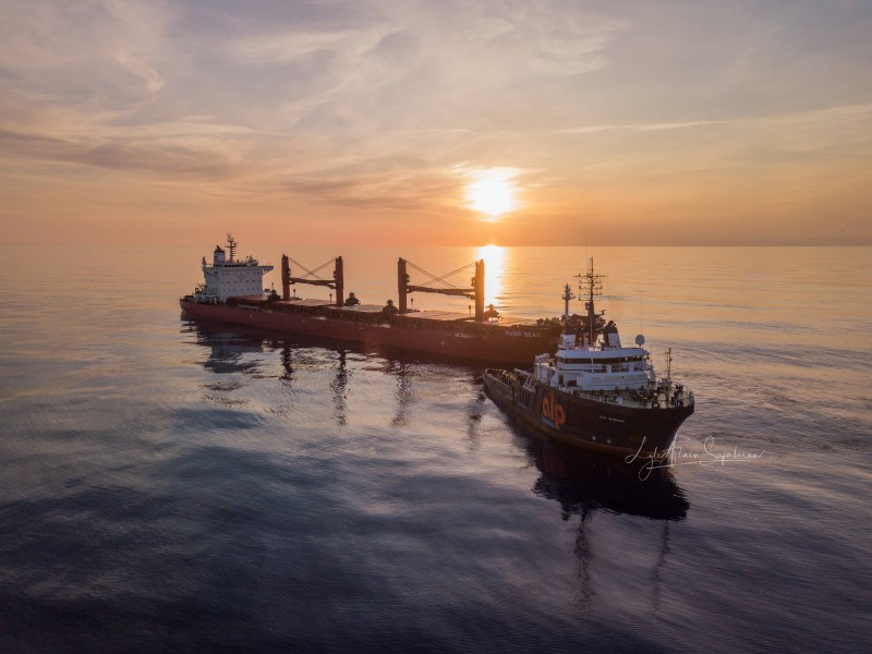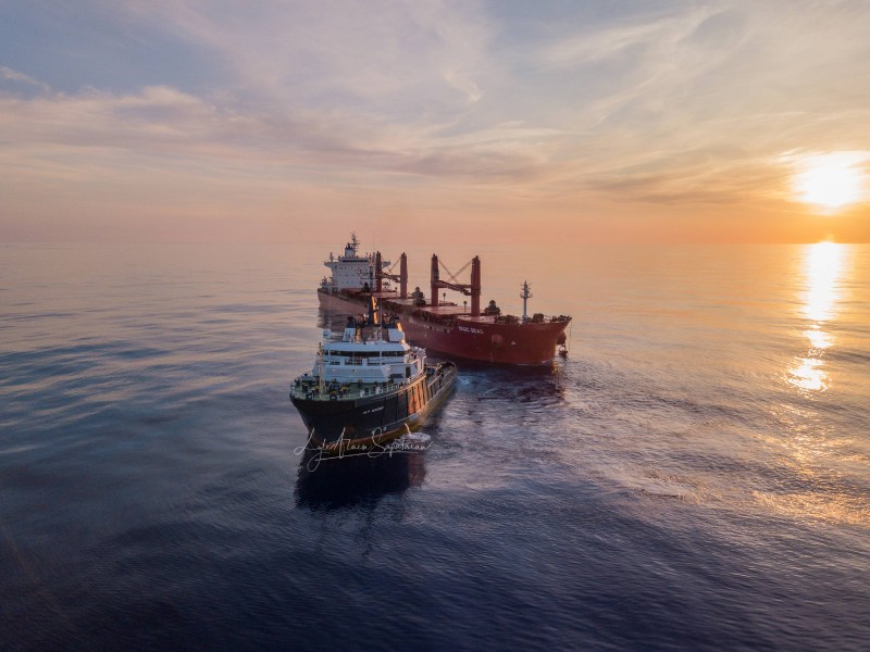 Following completion of the discharging operation on 7 June, Tsavliris deployed the AHTS "LEADER Z'' (BHP 10,800 – BP 131) from her base at Piraeus, to tow the vessel to Piraeus.