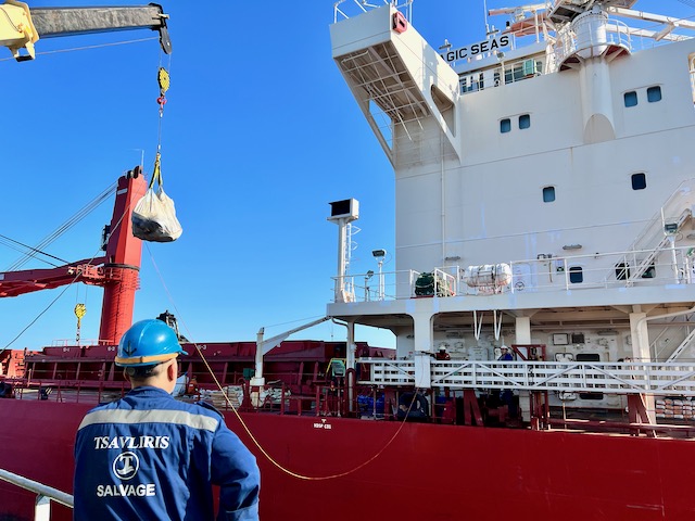 On 19 April, Tsavliris were contracted to provide salvage assistance and on the same day the AHTS "ALP WINGER" (BHP 19,000 – BP 218) was mobilised from the port of Algeciras, Spain. The salvage team and equipment (despatched from Greece) on board the "ALP WINGER" consisted of salvage engineer, riggers, welders, fitters and divers. Moreover, prior to departure, three semi-submersible pumps of 100 m3/h each were placed on board the tug for installation in the casualty's tailshaft space.