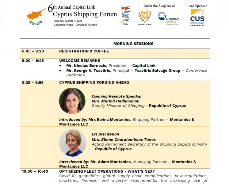 The successful 6th Annual Capital Link Shipping Conference took place in Limassol, Cyprus (Columbia Plaza) on 7 March 2023 under the auspices of the Republic of Cyprus and the Ministry of Shipping. Chairman of this important conference was George A. Tsavliris.