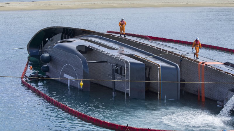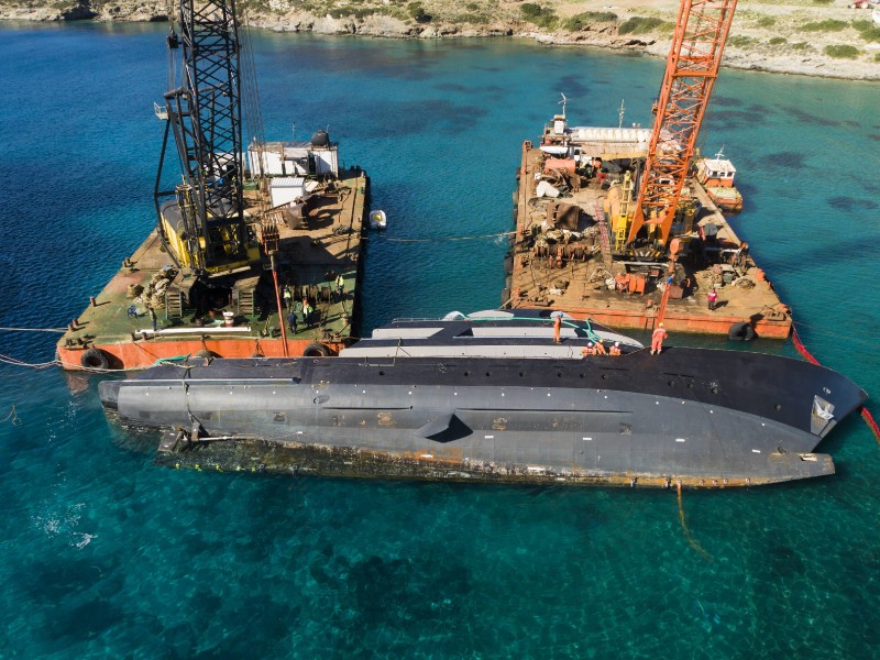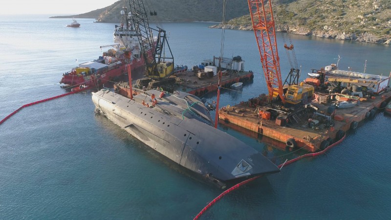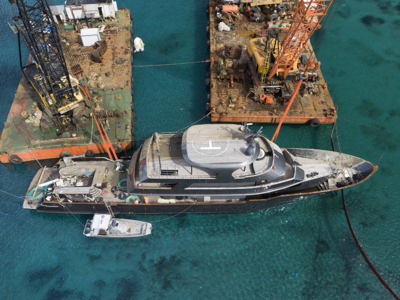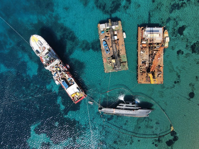 Following all safety protocols, the yacht was refloated and turned to upright position. List was corrected by moving weights internally.
